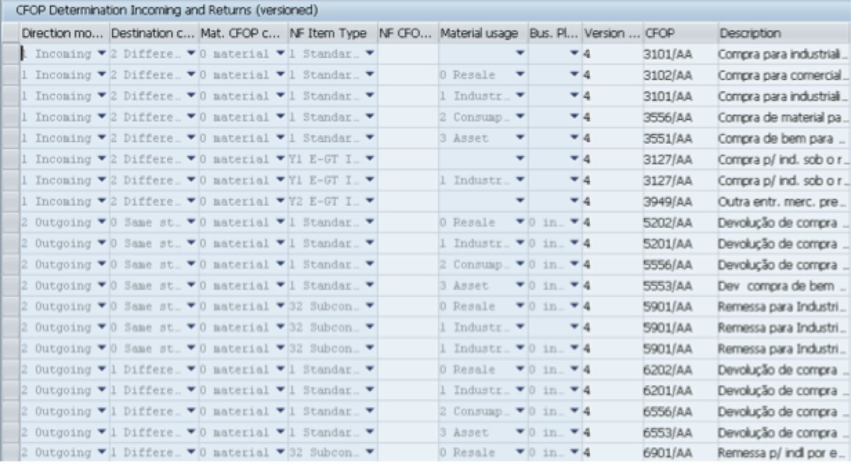 IMG > Cross-Application Components > General Application Functions > Nota Fiscal > CFOP Codes > Define CFOP Determination for Goods Receipts and Returns (Versioned)