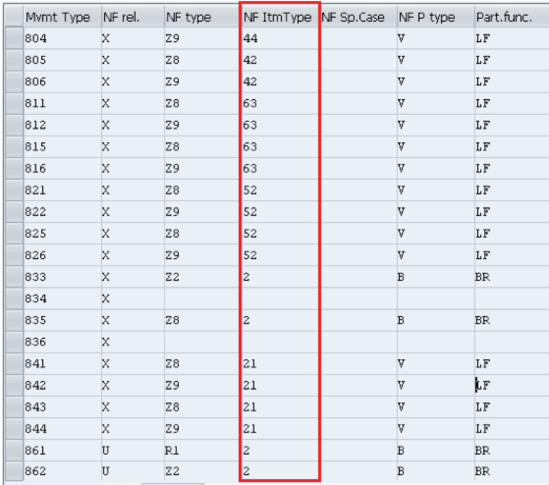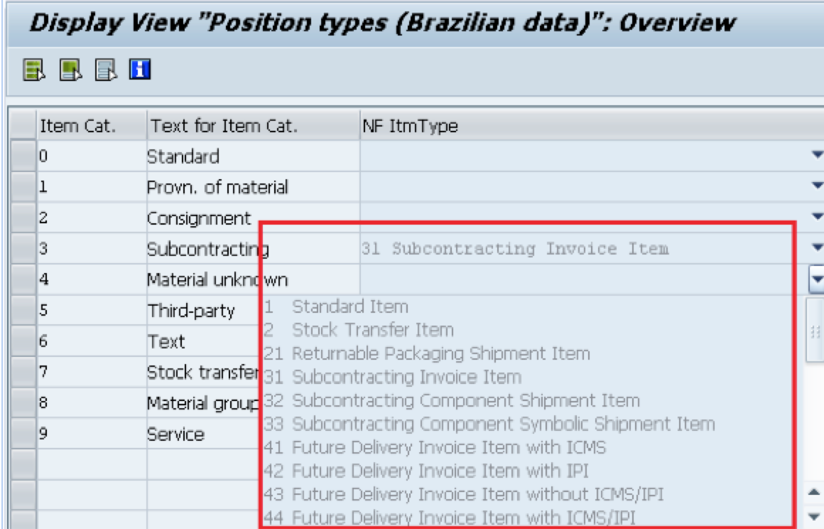 This table is used to assign a Nota Fiscal (NF) Item Type and a main partner function (such as the ship-to party) to a specific combination of sales order type and item category. Additionally, it allows you to define which SD tax codes should apply and whether the system should calculate ICMS and IPI taxes statistically.