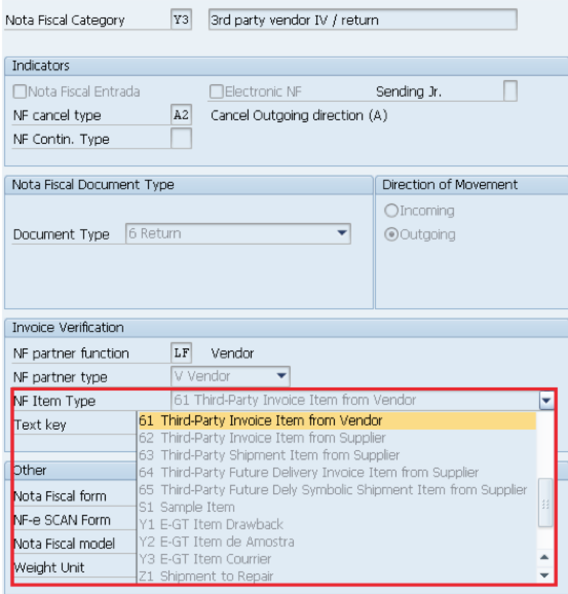 If the correct combination of parameters (including NF Item Type) exists in these tables, SAP will assign the CFOP automatically to the incoming or outgoing NF document. Let’s take a look on each of the configurations where the nF Type can be assigned: