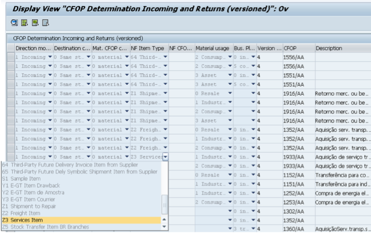 Once the NF Item Type is determined, it is used to match against entries in the CFOP determination tables: