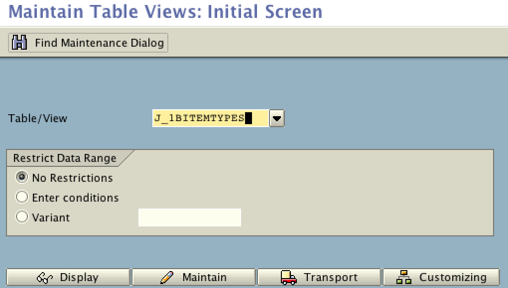 Use transaction SM30 to maintain table J_1BITEMTYPES.
