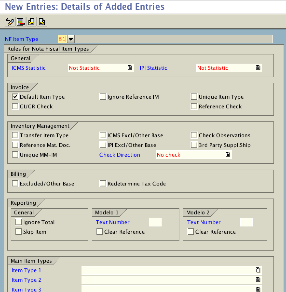 SAP delivers only a limited number of NF Item Types by default. However, considering that there are over 300 CFOP codes for incoming and outgoing transactions, it is often necessary to create custom NF Item Types to support automatic CFOP determination accurately across various scenarios.