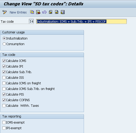 SPRO > Financial Accounting (New) > Financial Accounting Global Settings (New) > Tax on Sales/Purchases > Calculation > Settings for Tax Calculation in Brazil > Define SD Tax Codes