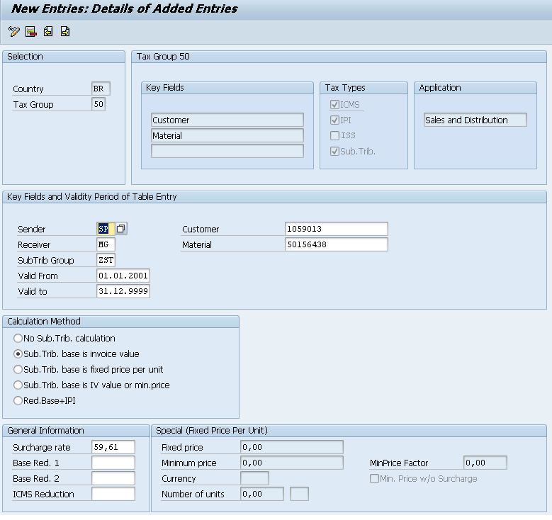 You can pick any tax group that fits your needs, I did select the combination of Customer and Material (here represented as group 50). If you are not familiar with tax groups, check the following posts: