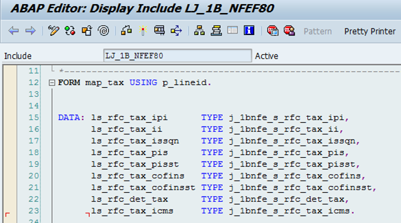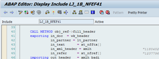 Into the function J_1B_NF_MAP_TO_XML the ERP tables information are read and it is made a preliminary mapping where it will populate the xml structure data (xmlh for header and xmli for item).