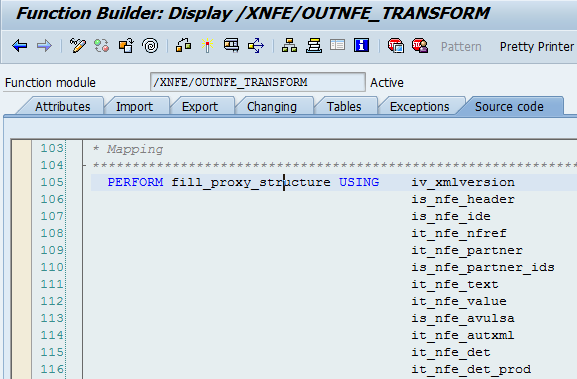 In the SAP Nfe, the program will get the data from SAP ERP and it will pass to the technical validation in the function /xnfe/outvalidation and if everything is technically ok, then the program will pass to the function /xnfe/outnfe_transform where the proxy structures are fulfilled as per screenshots below: