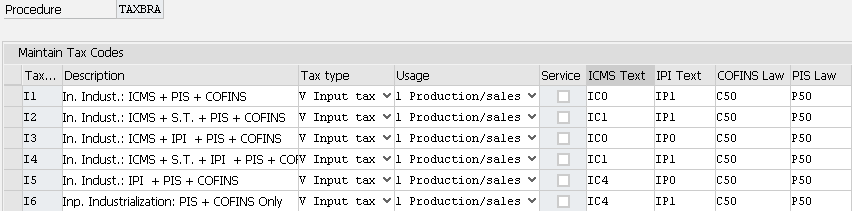 Similar situation occurs to the ICMS, however in this case, the ICMS Text Law is no present in the “standard ICMS Table” – Maintain ICMS Values (J_1BTXIC1), then the ICMS Law if maintained in Maintain ICMS Dynamic Exceptions (J_1BTXIC3) or Maintain ICMS Material-Dependent Exceptions (J_1BTAXIC2) is taken in consideration and if an entry is found without the ICMS Law populated or an entry is not found at all, same behavior has the IPI, the system will check what is maintained to the tax code in the J_1BTAXCODEV.
