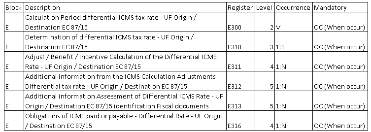IV – Added the records E300, E310, E311, E312, E313 and E316 in Table 2.6.1.4 – Block E: