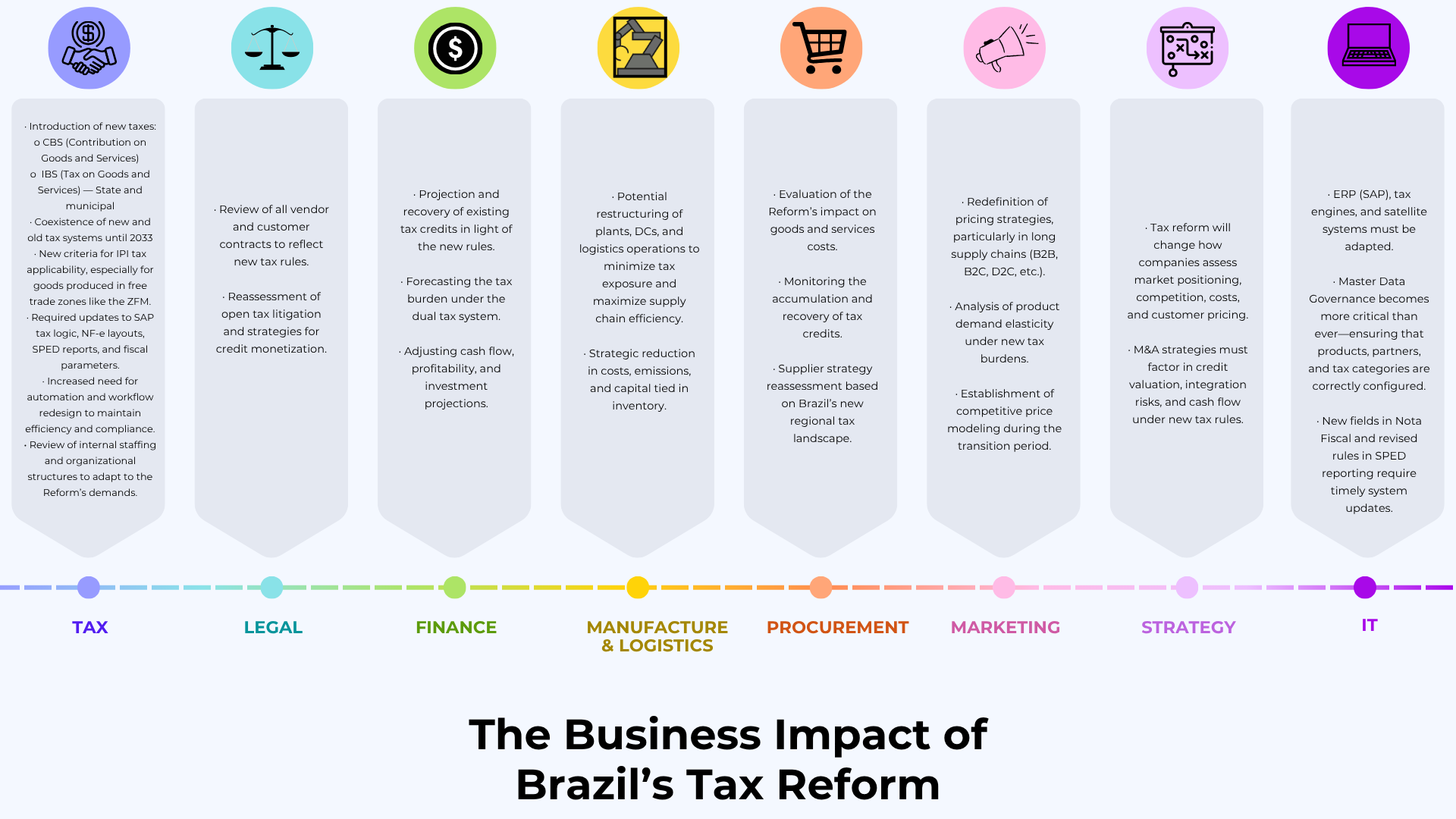 Brazil’s Tax Reform represents a massive shift in the country’s indirect tax system, and its effects go far beyond the tax team. To succeed during this transition, companies must assess how the Reform will reshape every area of their operations — not just in 2026, but across the entire transition period until 2033.